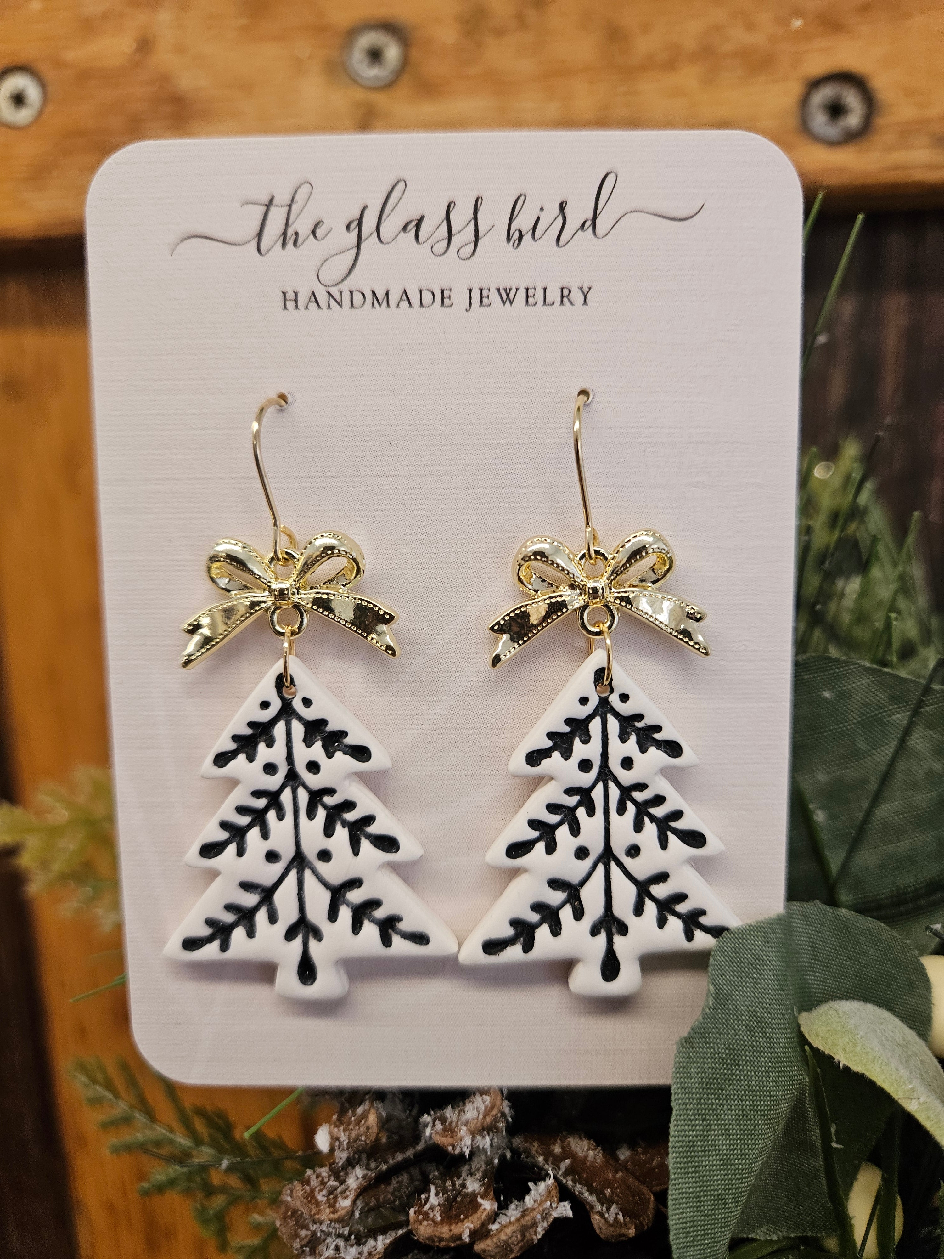 Celebrate the season with these festive bow tree earrings, featuring a crisp white and black tree design accented with a delicate gold bow charm. Handmade with care, these earrings are lightweight, stylish, and perfect for adding a subtle holiday sparkle to any outfit. Designed for everyday wear, they make a thoughtful gift for yourself or someone special.