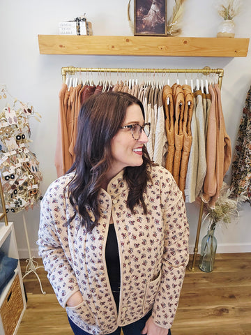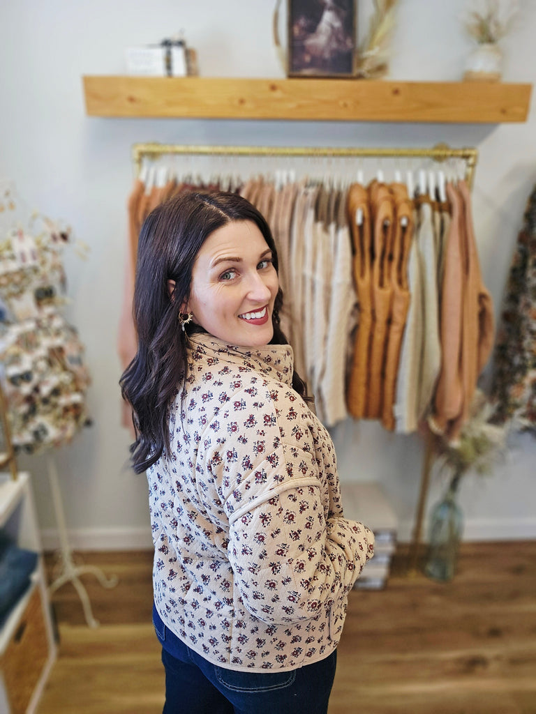 Cozy meets timeless style in this ditsy floral quilted jacket. Designed with a polar neckline, button-down front, and long sleeves, it’s the perfect lightweight layer for transitioning seasons. The oatmeal base with delicate floral print adds a soft, feminine touch while the patch pockets keep it practical and easy to wear.