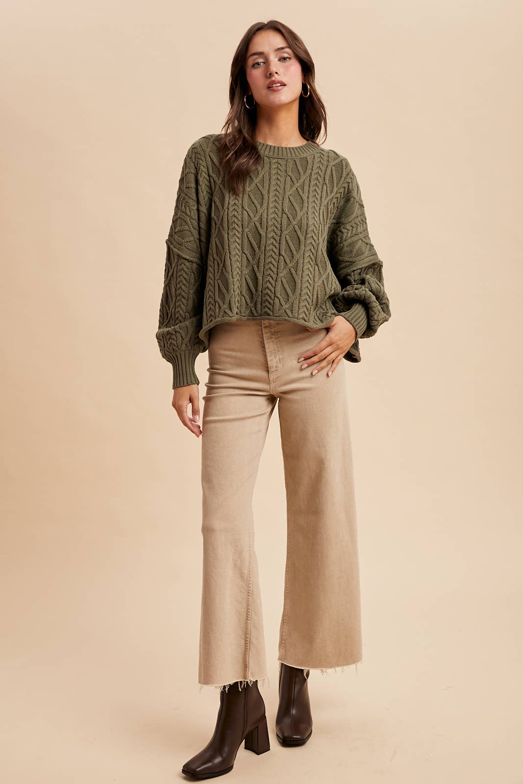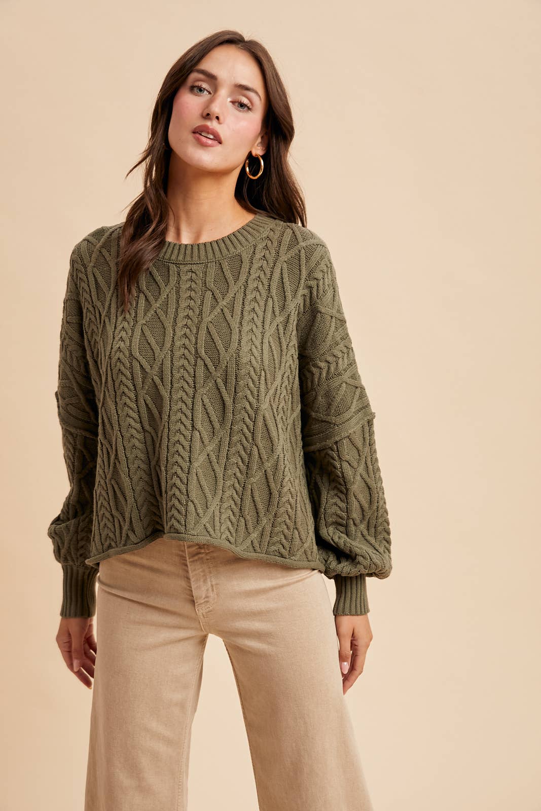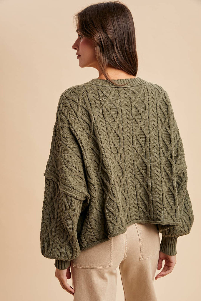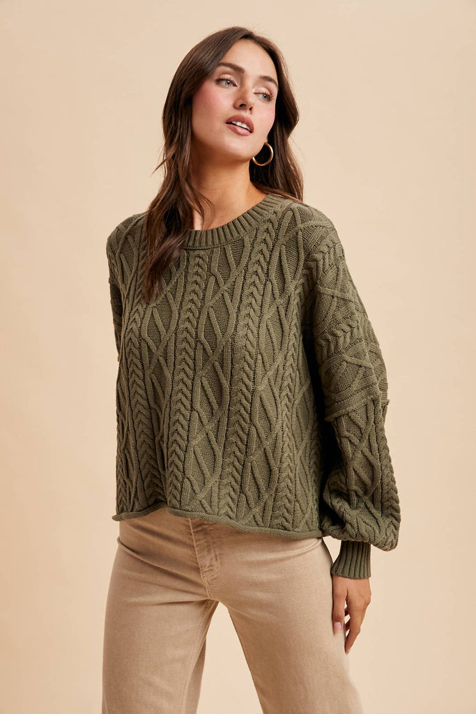 Olive Cable Knit Pullover Sweater – Women’s Cotton Blend Crewneck