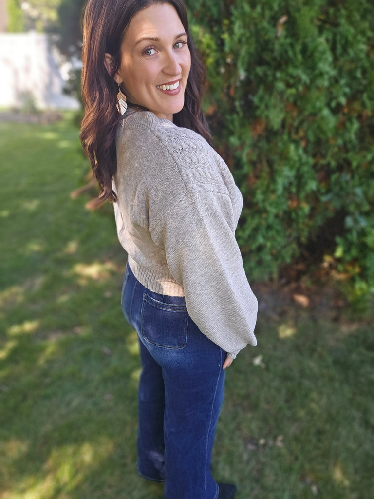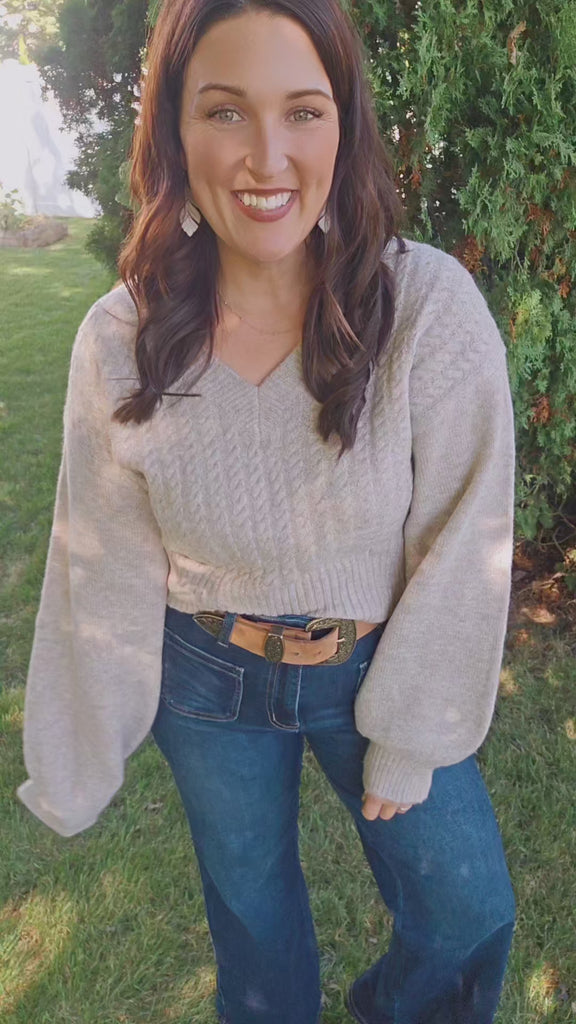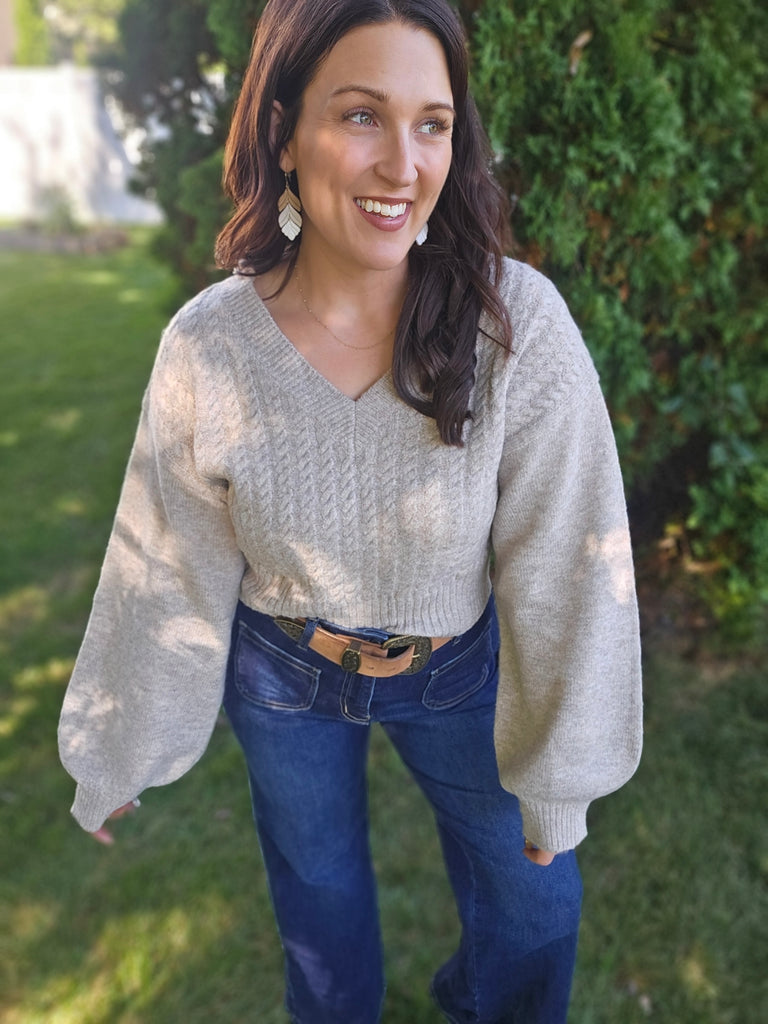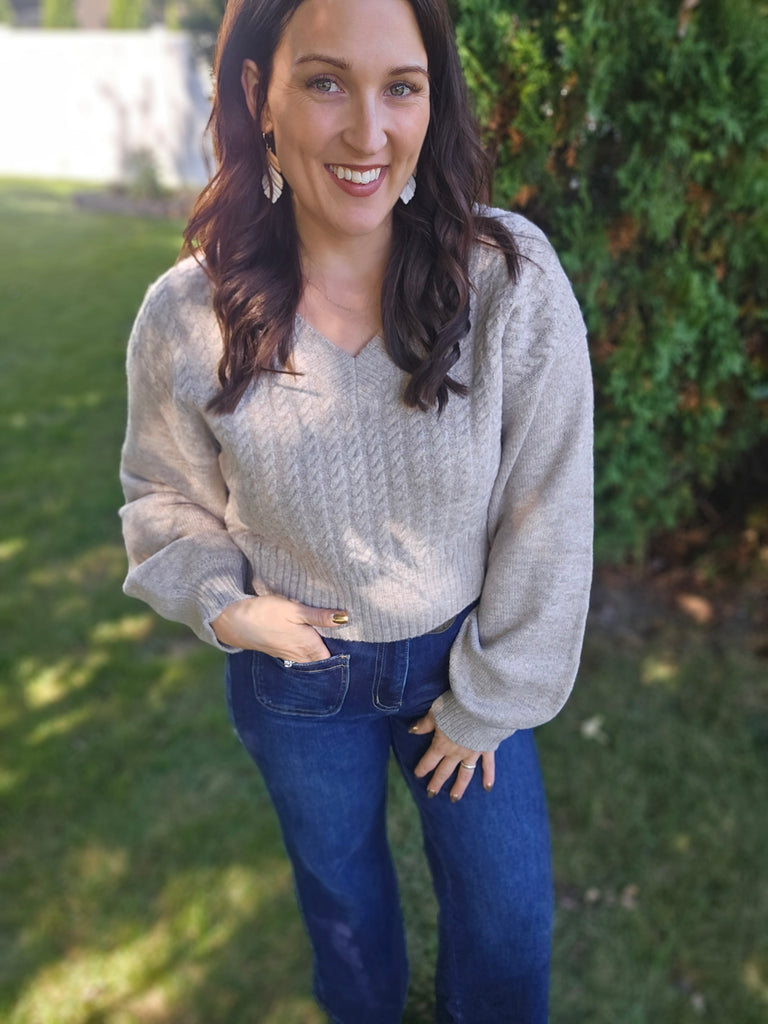 Embrace cozy sophistication in this timeless cable-knit sweater. Designed with a flattering V-neckline and an intricate all-over cable-knit pattern, it brings both texture and charm to your wardrobe. Voluminous balloon sleeves add a modern, romantic touch before tapering into snug ribbed cuffs, while the wide ribbed hemline offers a slightly cropped fit—perfect for pairing with high-waisted jeans, skirts, or trousers. Effortlessly chic, endlessly versatile.