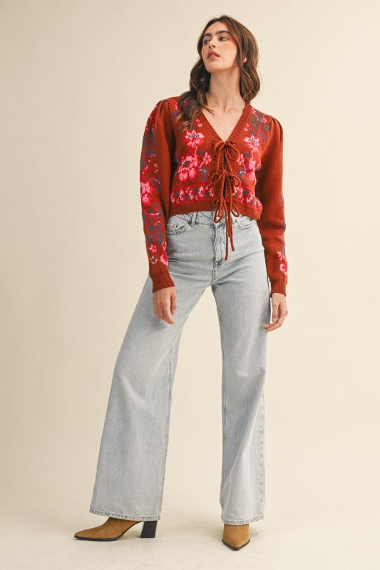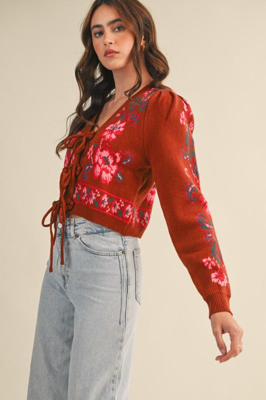 Floral Knit Tie-Front Cropped Sweater Cardigan