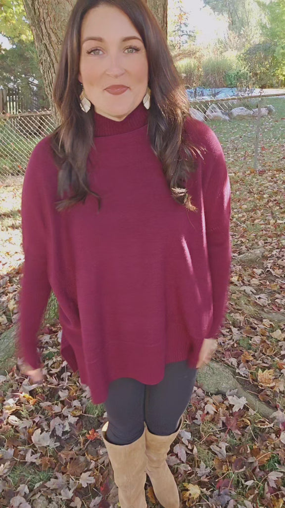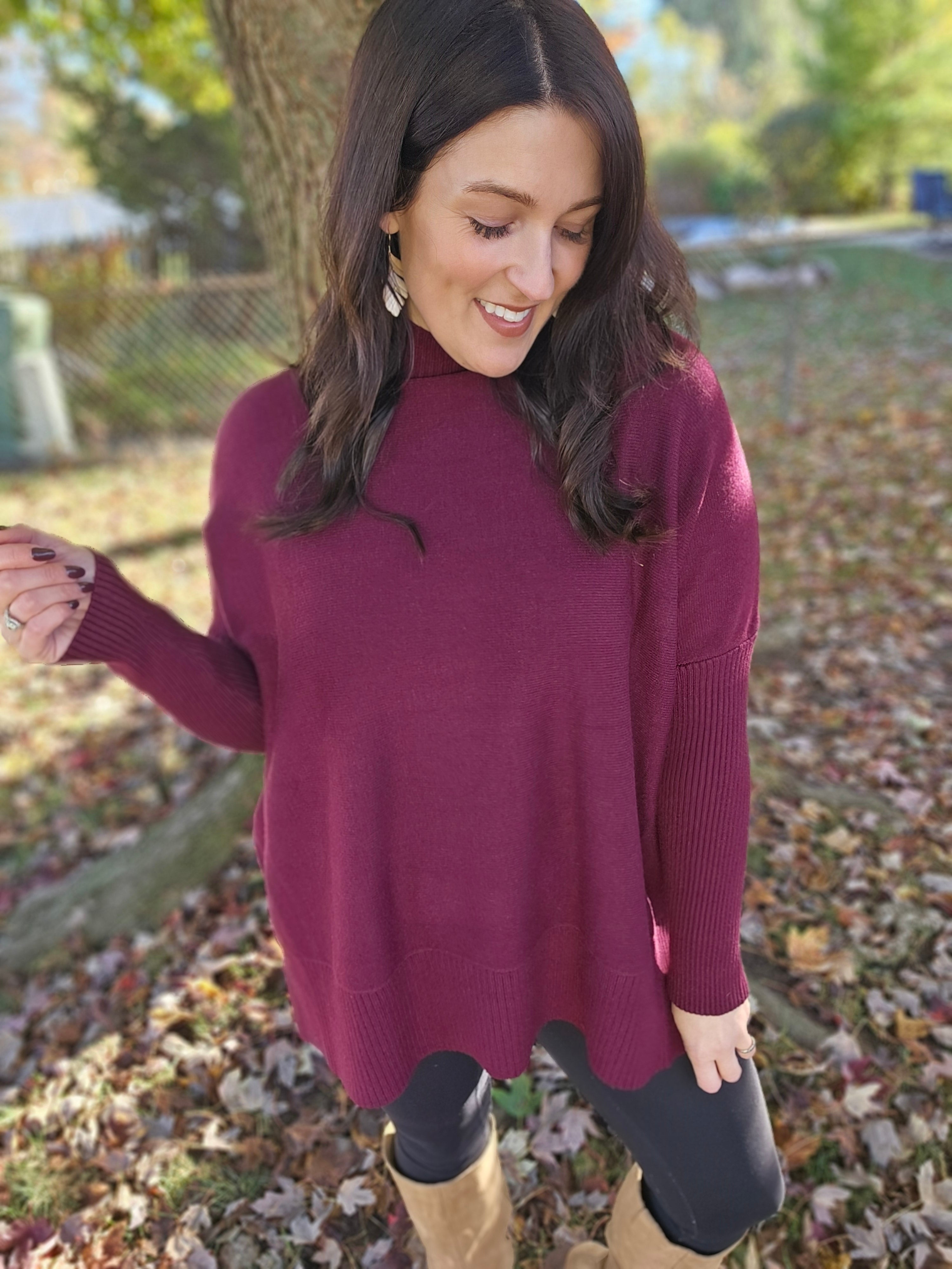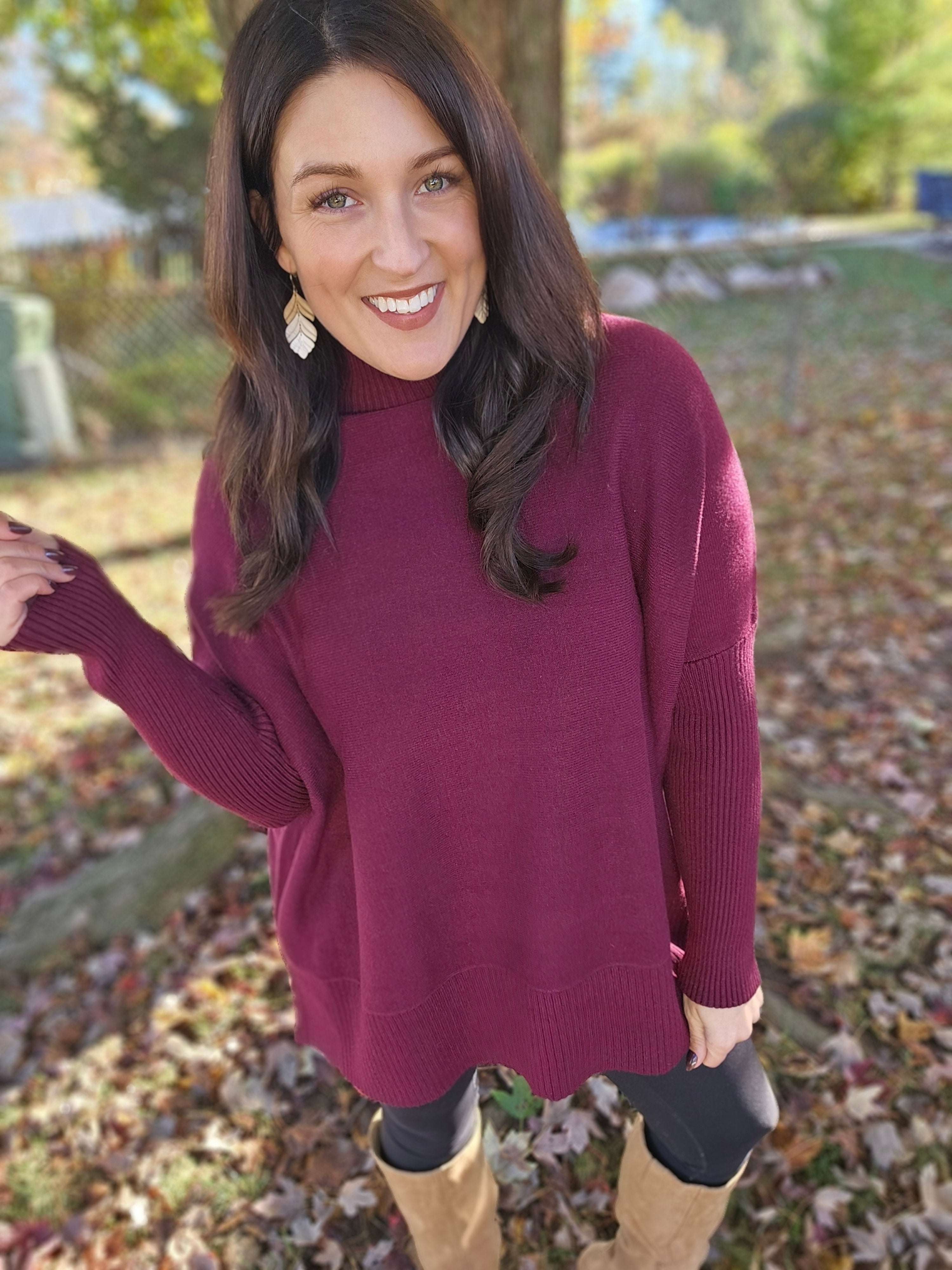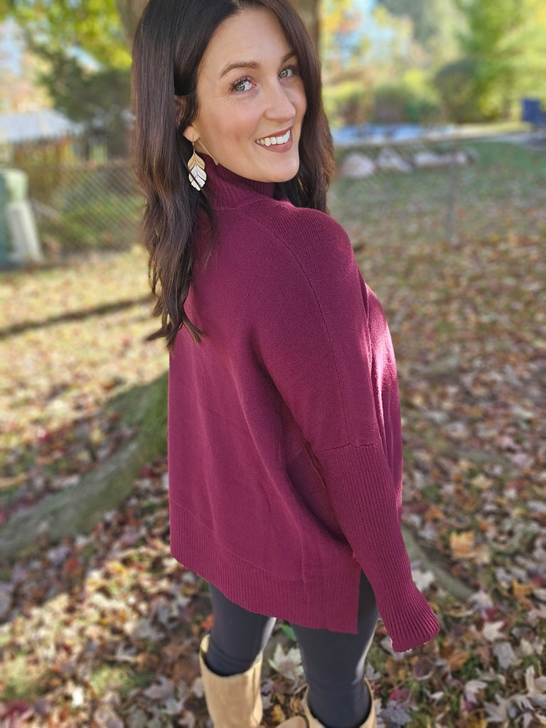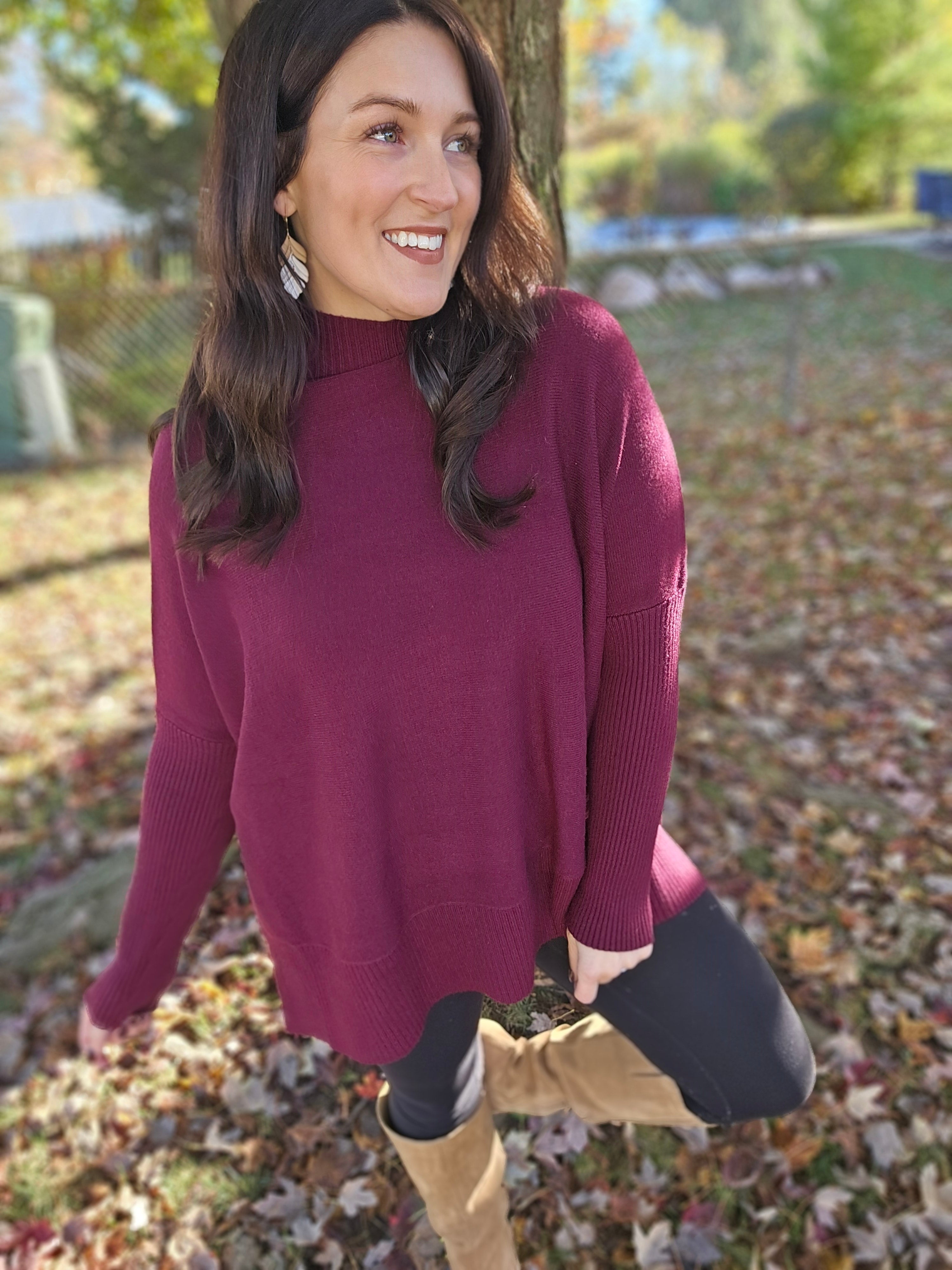 Cozy up in this effortlessly chic oversized sweater—perfect for the holidays and beyond. Featuring a mock neckline, relaxed fit, and side slits for easy movement and a flattering drape. The soft knit blend makes it a go-to for layering or pairing with denim and boots.