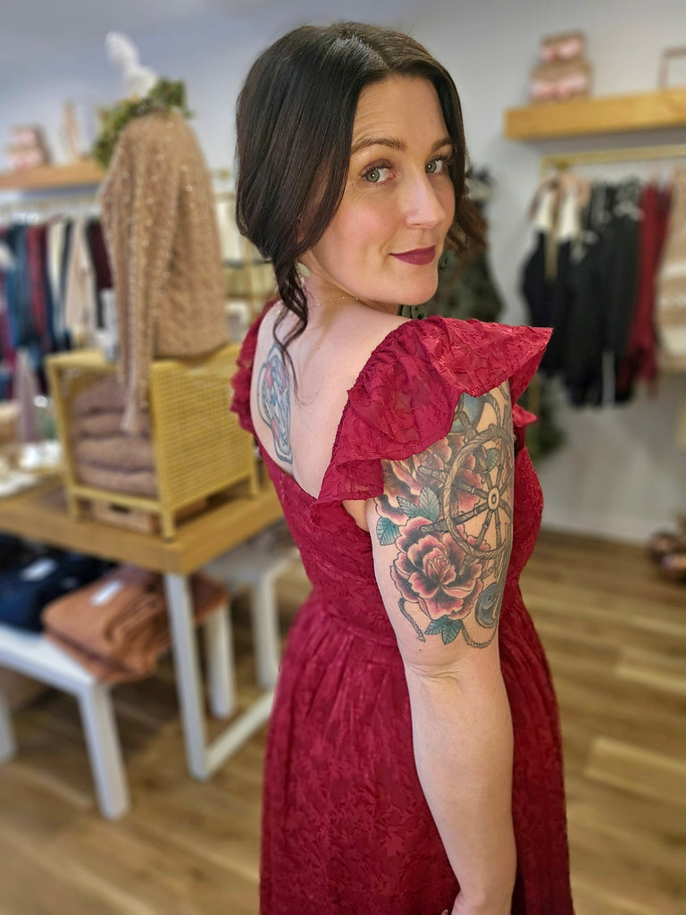 Step into the season in timeless elegance with The Winter Romance Jacquard Dress. Designed with a sweetheart neckline, ruffled shoulders, and a velvet waist tie, this holiday-ready midi dress is made to make an entrance. The luxurious jacquard fabric adds texture and shine, while the fully lined interior ensures a comfortable and flattering fit. Perfect for holiday gatherings, winter weddings, and festive celebrations, this dress is a showstopper for every special occasion.