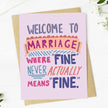 Welcome the happy couple to the reality of married life with this funny wedding card. Card reads "welcome to marriage where "fine" never actually means "fine". -A2 Size (4.25 x 5.5 inches folded). -Printed on premium 16pt thick cardstock with a matte finish. -Paired with a coordinated kraft or holiday color envelope. -BLANK INSIDE -Hand Drawn