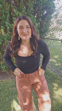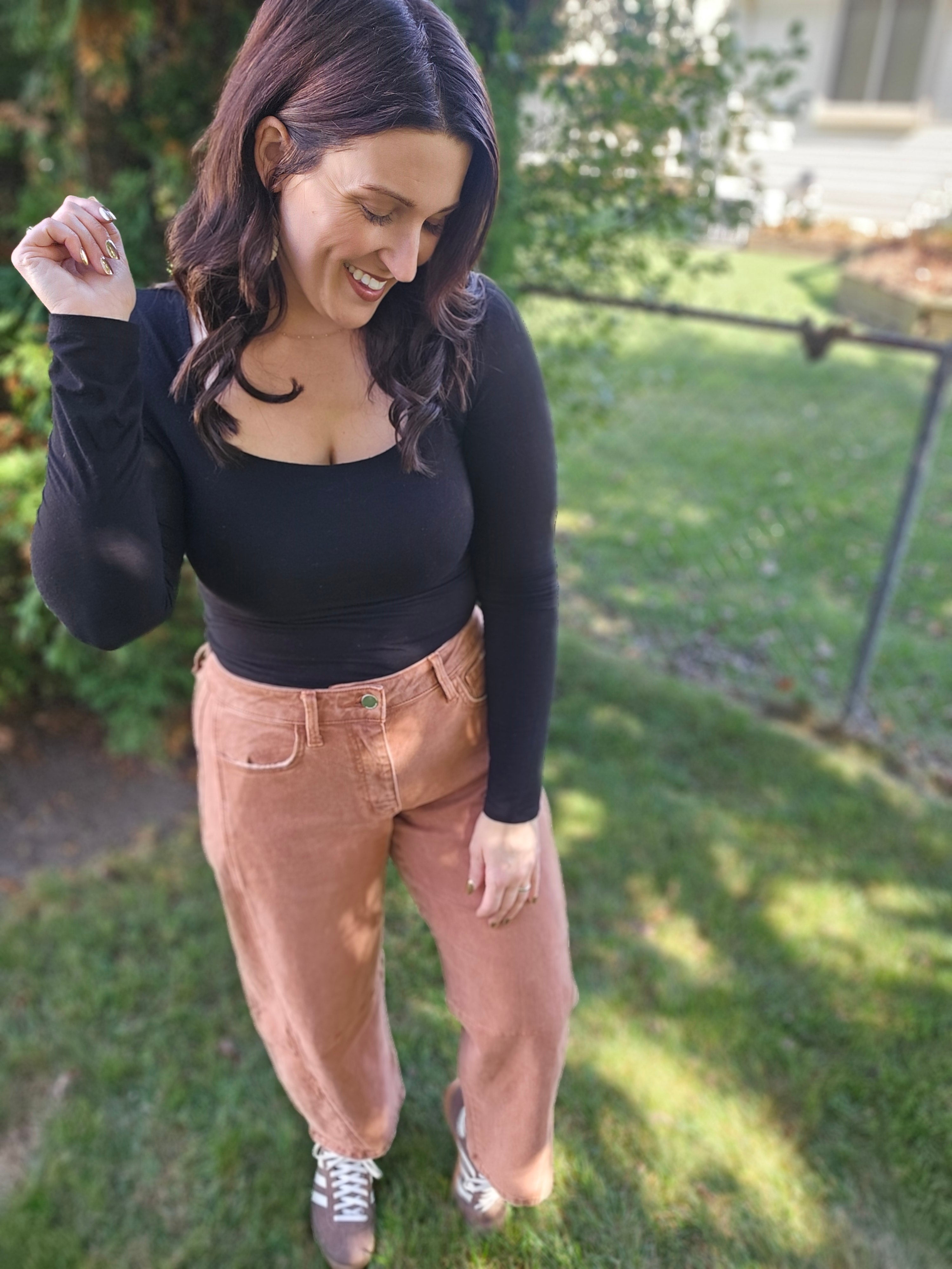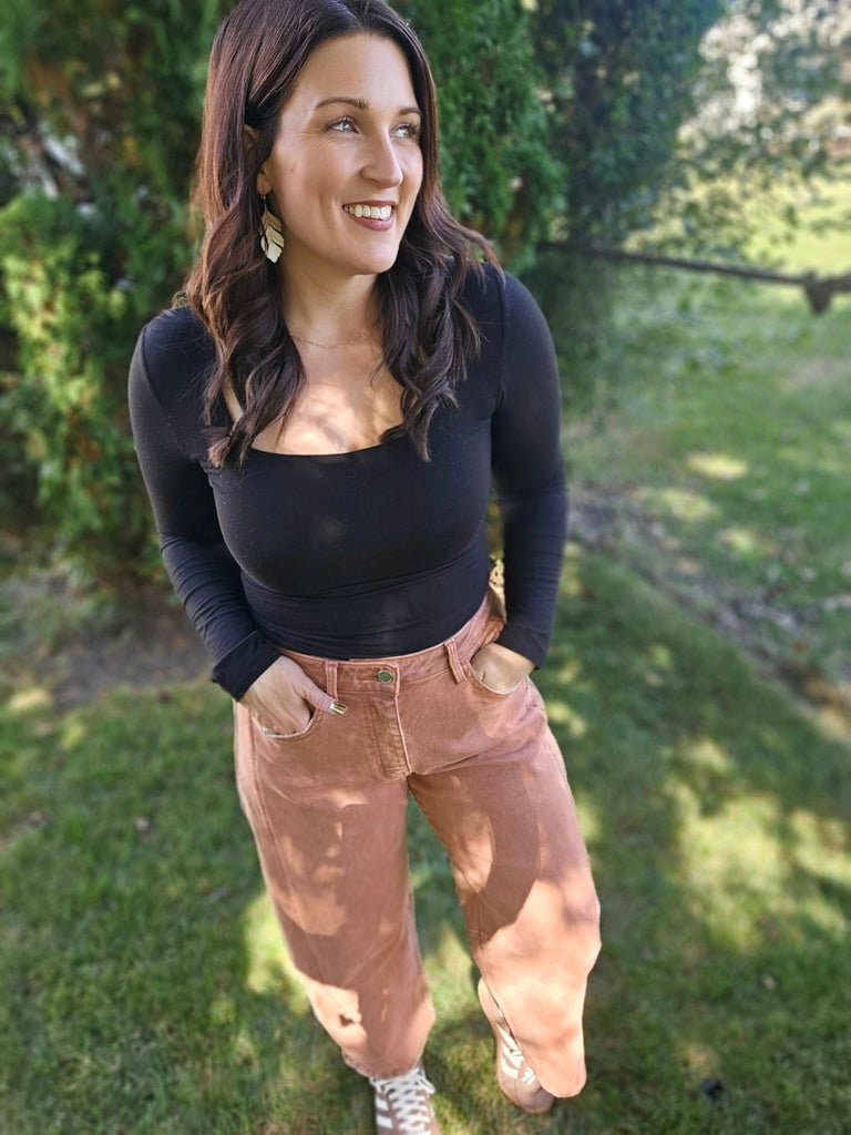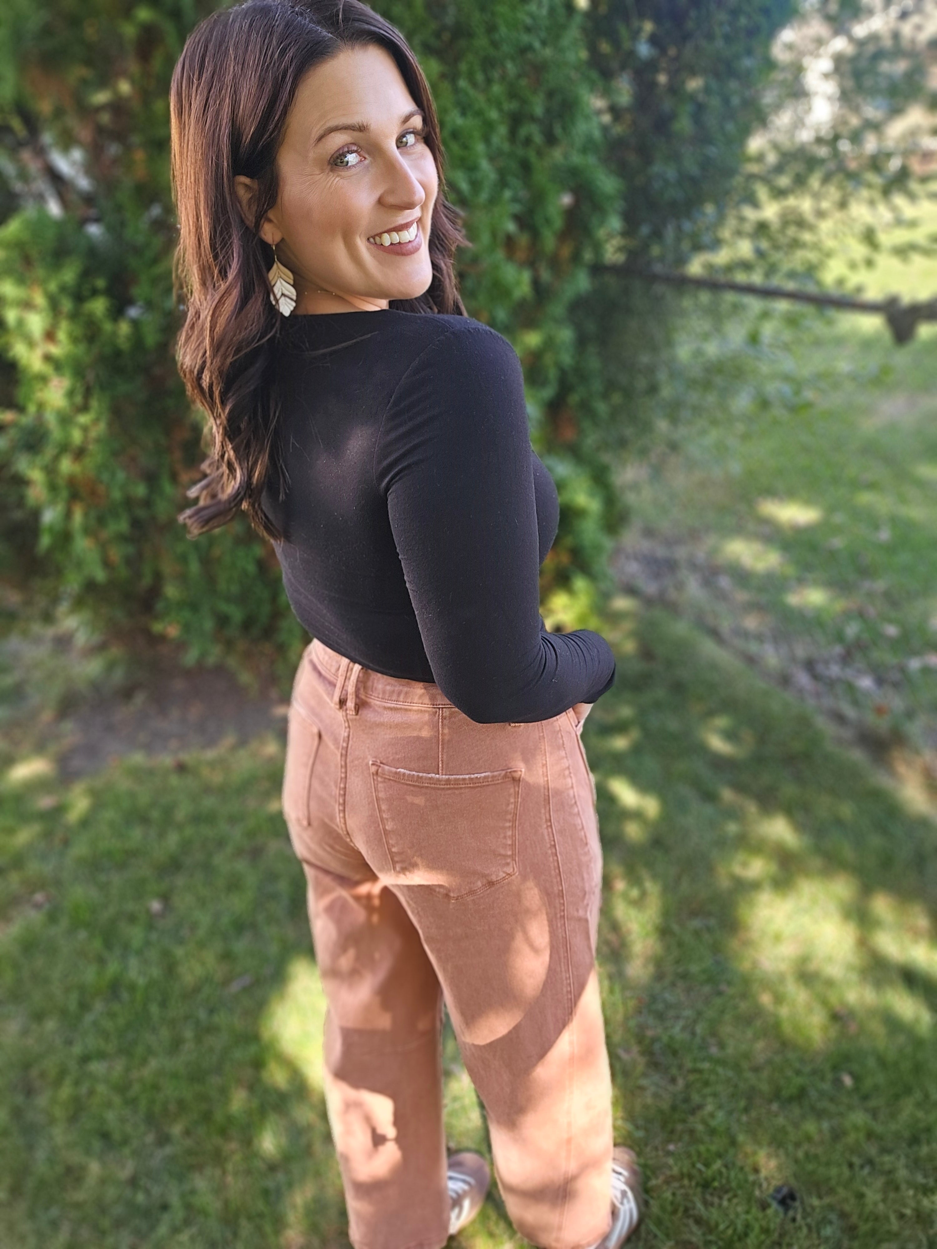 High Rise Twist Barrel Jeans in a rich copper hue. Crafted from comfort stretch denim, these jeans feature a flattering high-rise waist, unique seam detailing, and a cropped length. The twist barrel silhouette gives them a modern, fashion-forward edge while still being easy to wear every day.