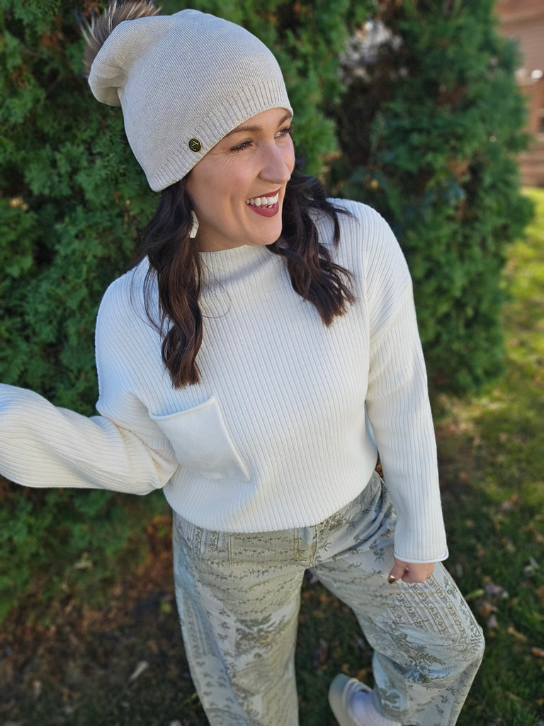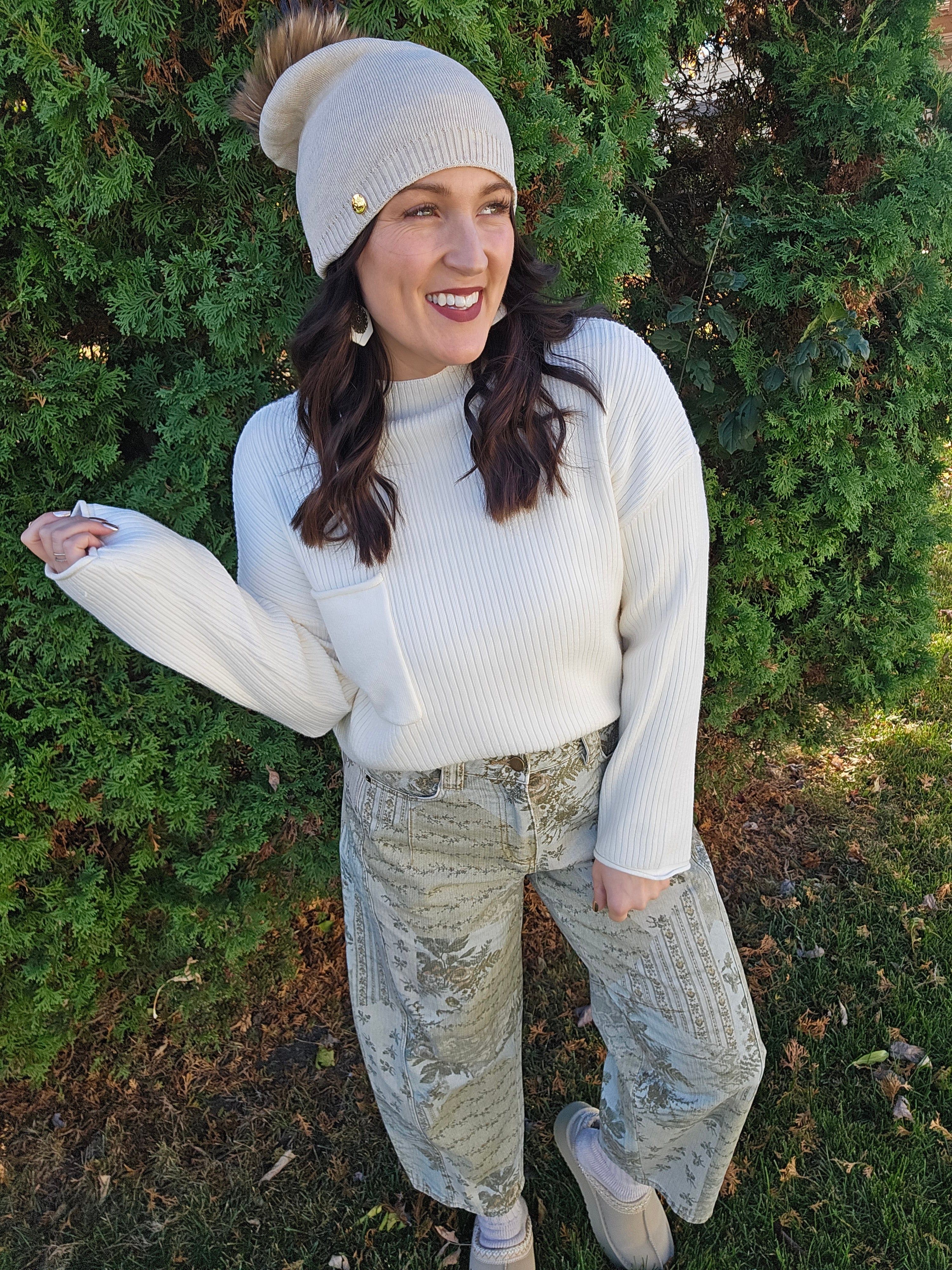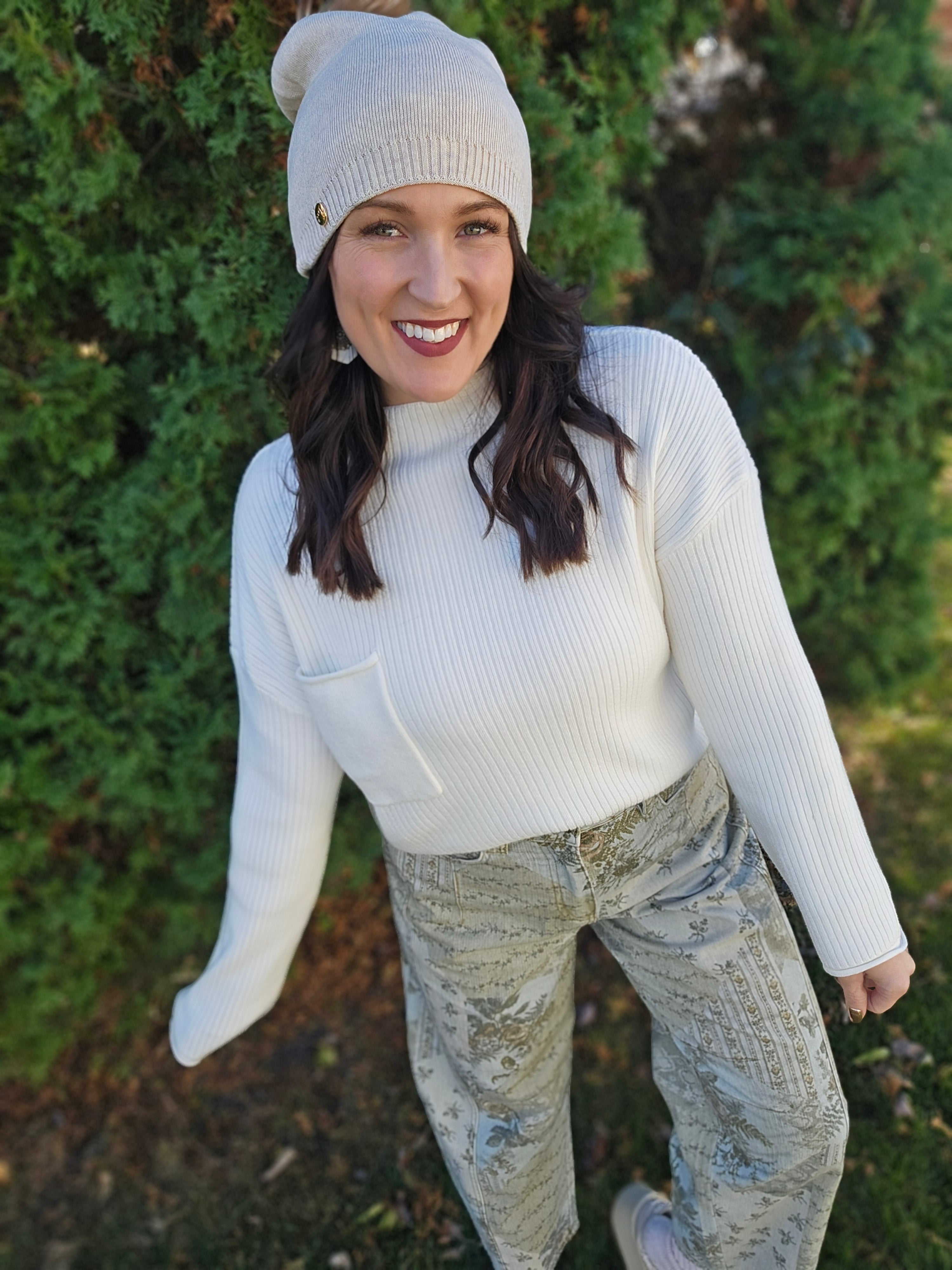 Stay effortlessly cozy in our Snowdrift Pocket Sweater, a soft and stylish staple for cooler days. This cream-colored pullover features a relaxed fit with a mock neckline, drop shoulders, and extended sleeves for that perfectly slouchy look. The ribbed knit pattern adds texture and warmth, while the front pocket detail brings a laid-back touch.