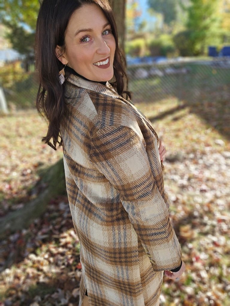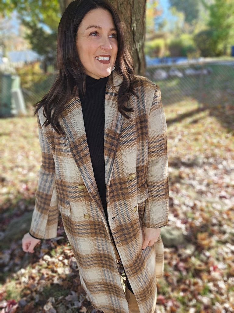 Elevate your outerwear collection with our Heavyweight Plaid Duster Coat, a timeless layering piece designed for both warmth and style. Crafted from a durable heavyweight fabric, this longline coat showcases a classic plaid print that adds a chic, effortless touch to any look. Functional front buttons allow for versatile styling, while roomy patch pockets provide both convenience and charm. Fully lined for comfort and structure, this duster coat is ideal for transitioning through chilly fall days into crisp winter nights. Style it with denim and boots for an everyday vibe, or layer over a sweater dress for a polished cold-weather outfit.