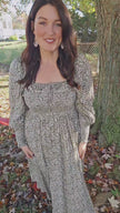 Effortlessly feminine, the Olive Garden Maxi Dress is crafted in a soft olive and creme floral rayon fabric for a light, flowing silhouette. Featuring a smocked bodice front and back with delicate ruffle details, smocked sleeve ends, and a flattering square neckline, this dress combines comfort and style. Fully lined for a polished finish, it’s perfect for brunches, weddings, or any daytime occasion.